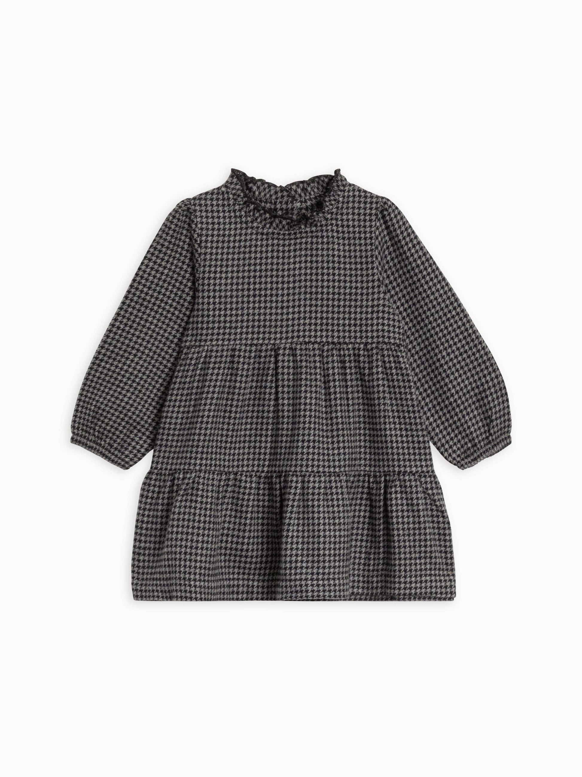 Celebrate the season with the Neela Flannel Ruffle Neckline Long Sleeve Dress, designed to make every holiday moment special. This charming dress features a ruffle neckline with a purl edge and a gathered sleeve cap for a touch of festive flair. The gathered tiered skirt adds a playful and elegant finish, while the back button placket ensures easy dressing.