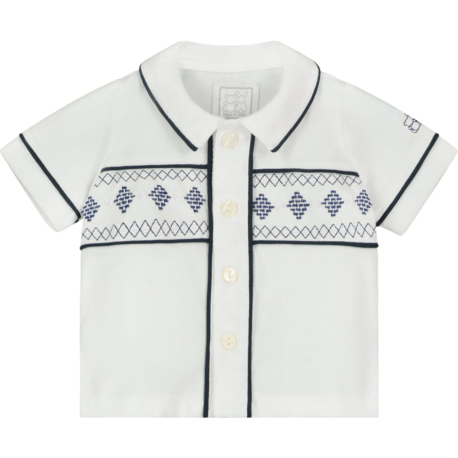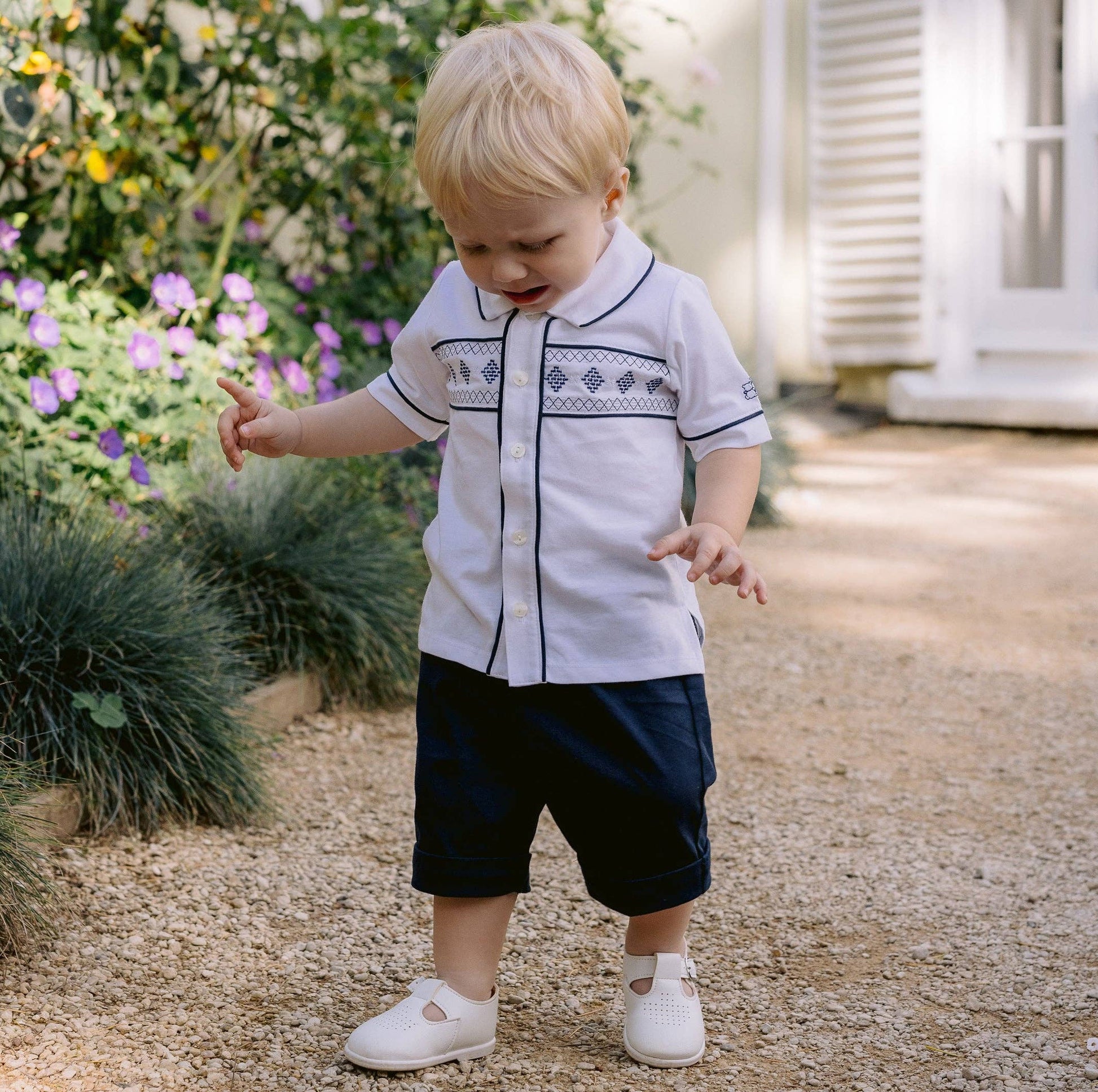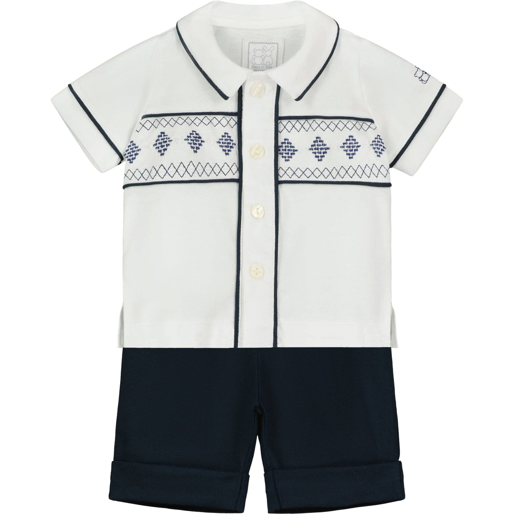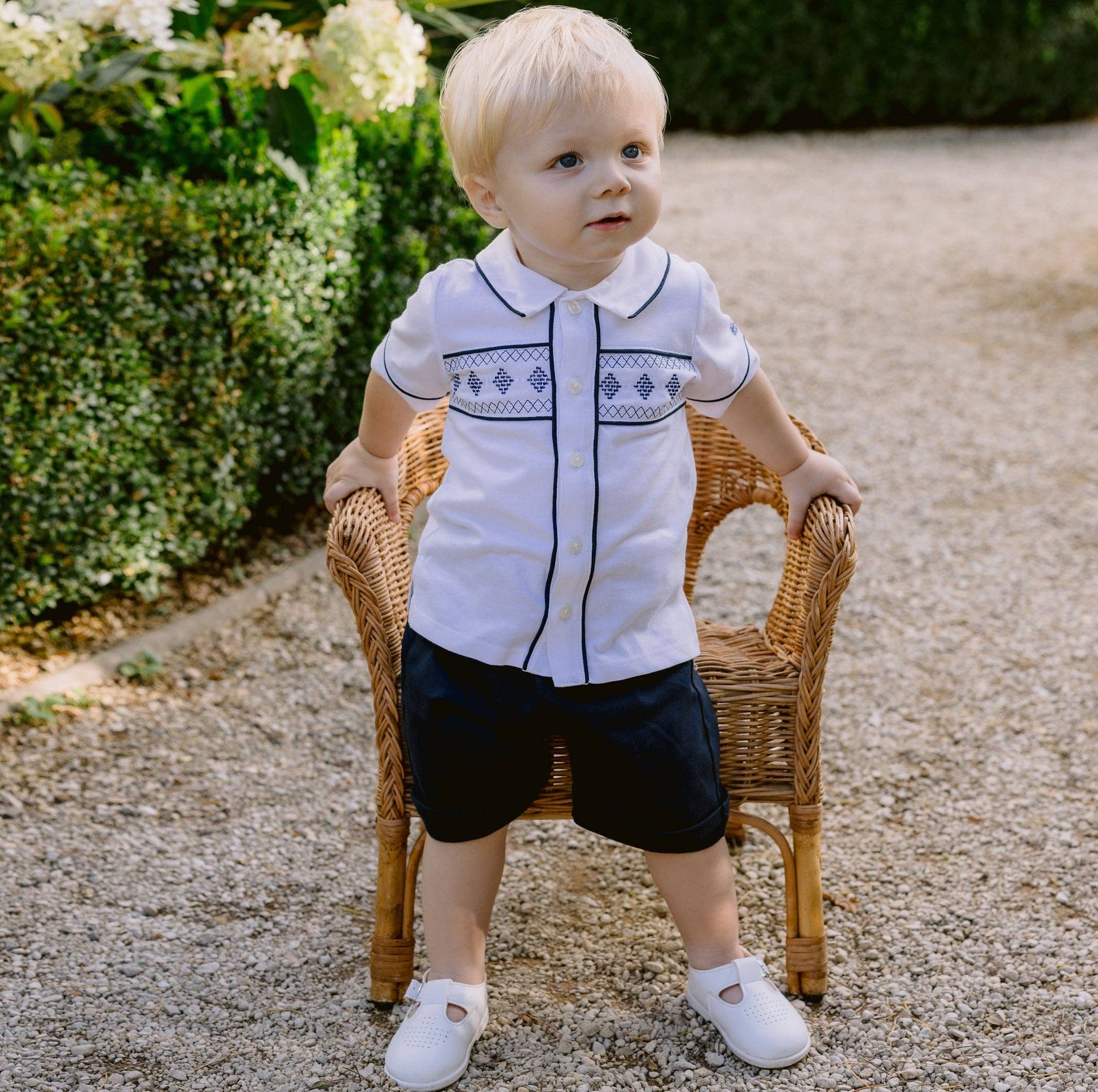 Finer Details: Diamond pale blue & white embroidery, smart baby boy outfit, and contrasting navy shorts.