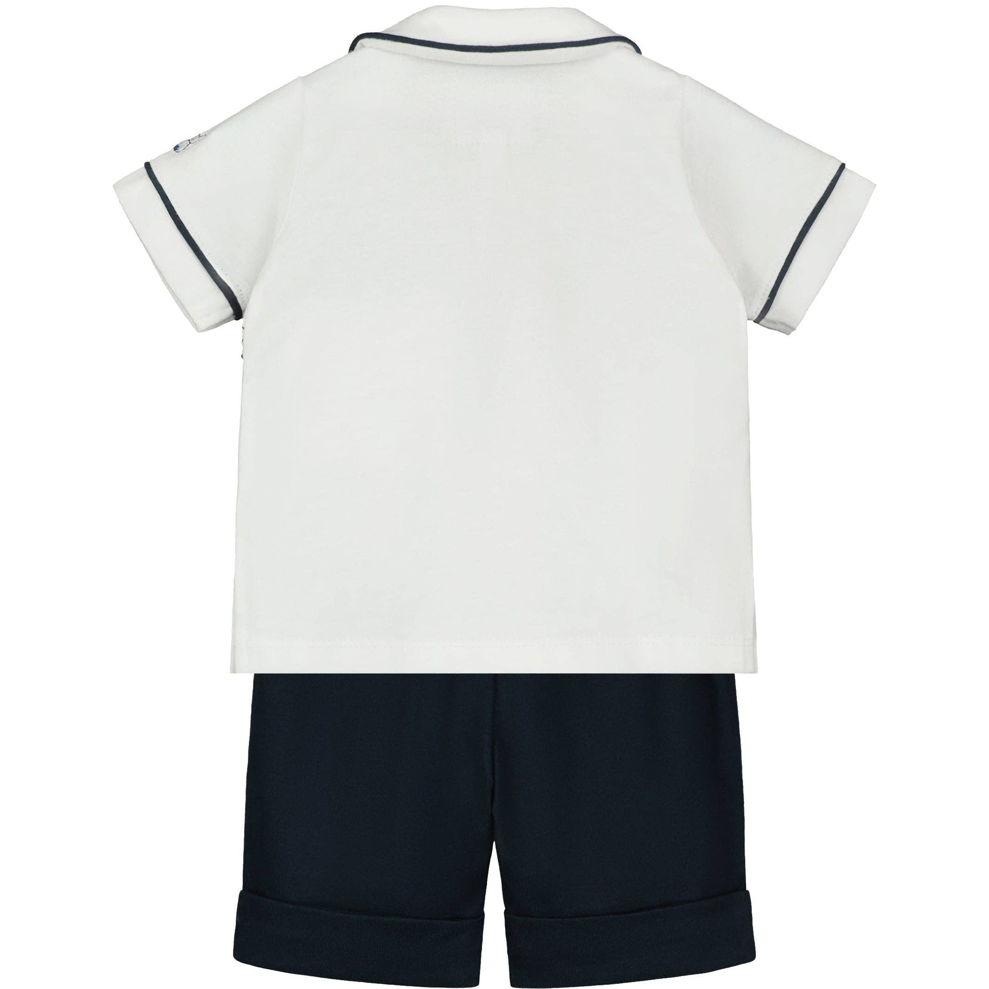 When something a little smarter is required, but still cool and comfortable for your baby boy, this two-piece is the perfect choice. On the shirt the collar, sleeves and front panels are edged in navy piping. An intricate diamond embroidered panel in navy and pale blue lays across the chest. Teamed with navy shorts with smart turnups, this a perfect summer wedding outfit.