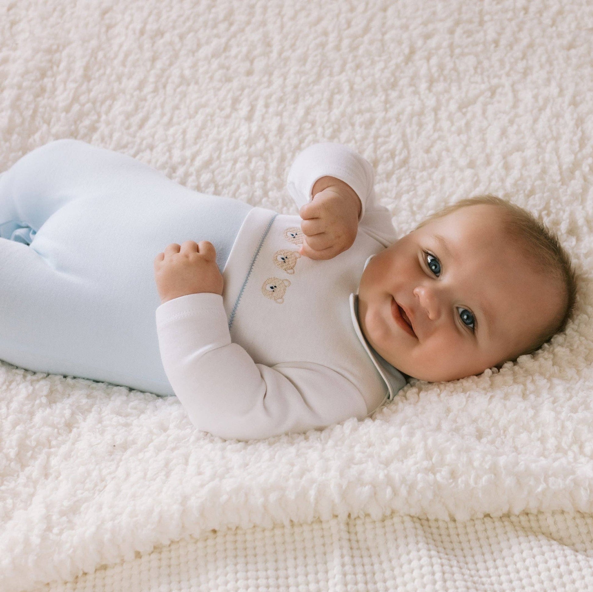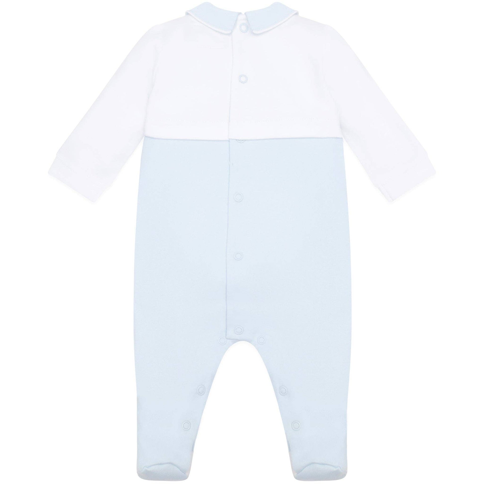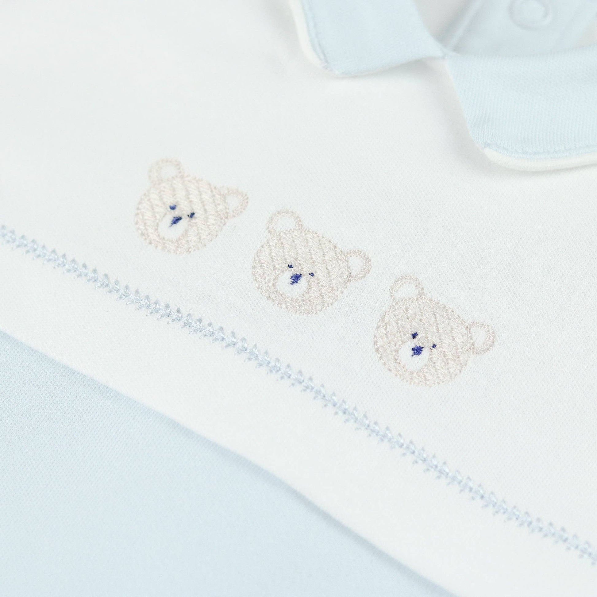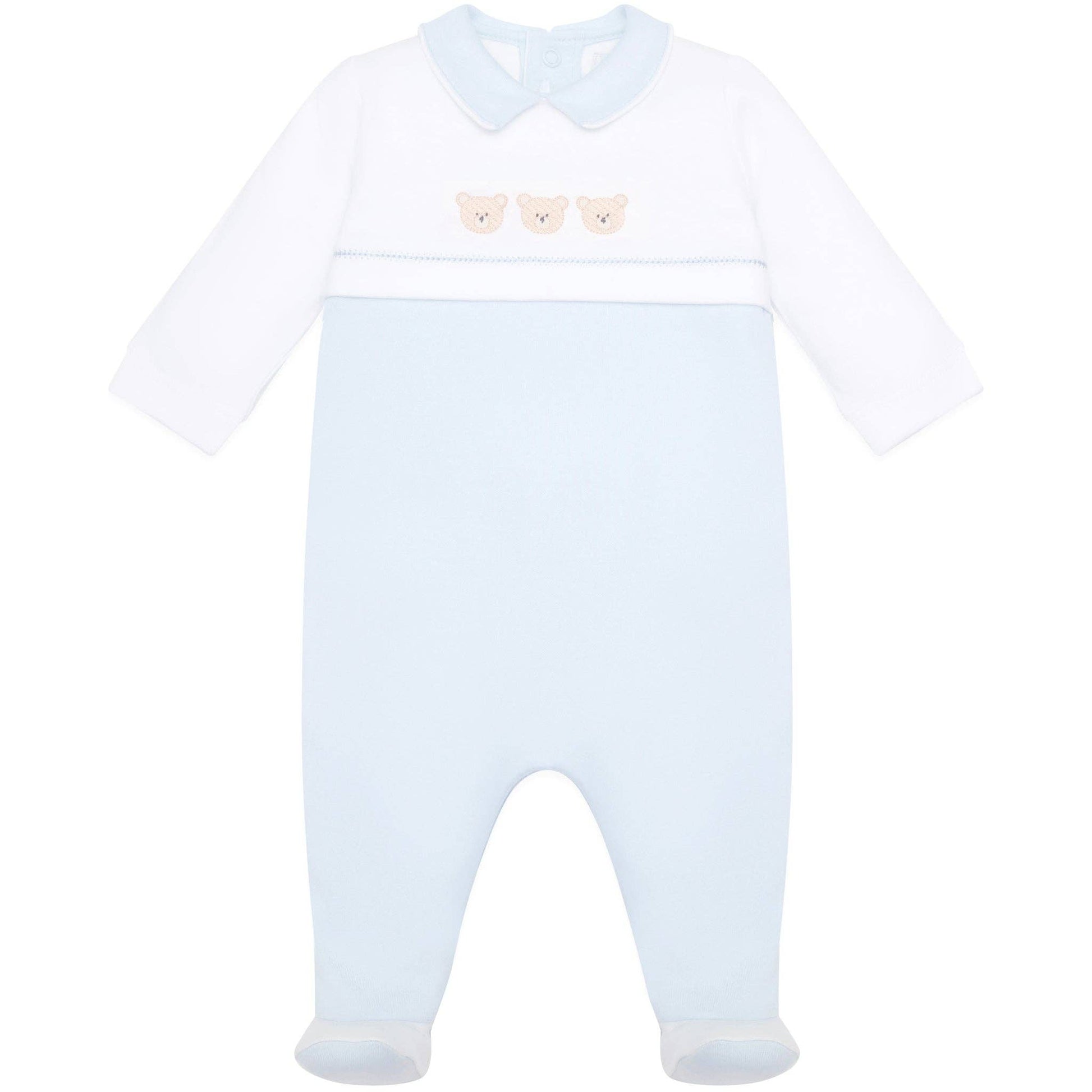 Jasper is a traditional baby boy's babygrow that is relaxed and comfy in styling. The top half of the garment is white with a pale blue collar and the contrasting lower part of the garment is our signature pale blue. Three gorgeous bear embroideries and a matching blue pull on hat, make this a cute piece for new baby boys.