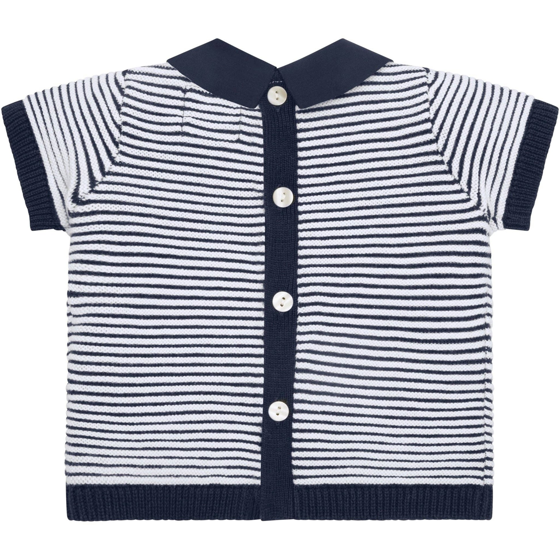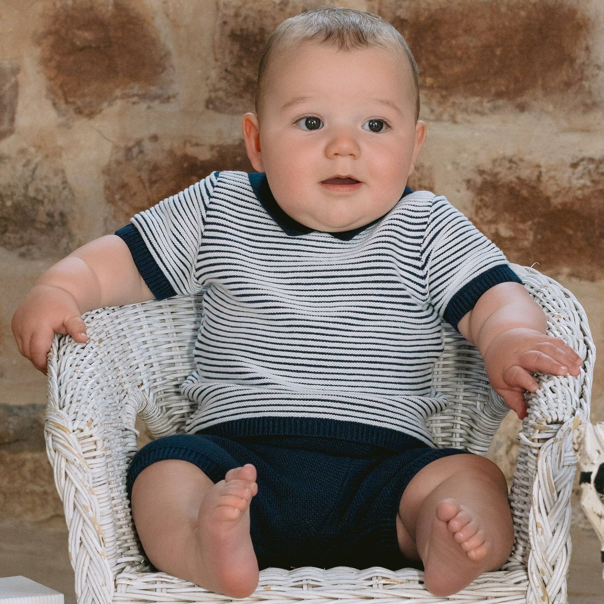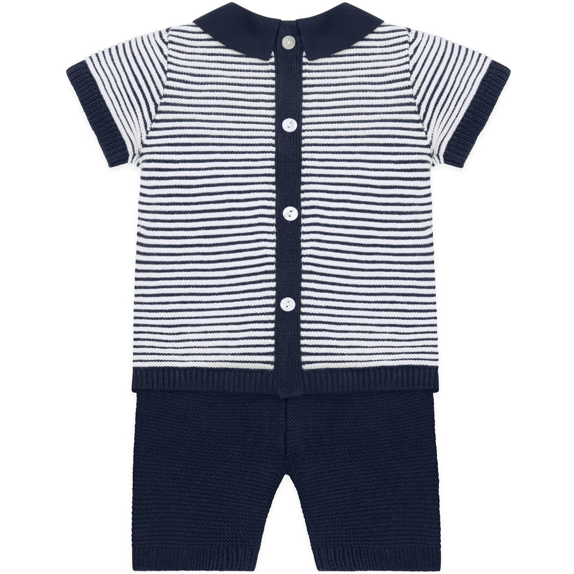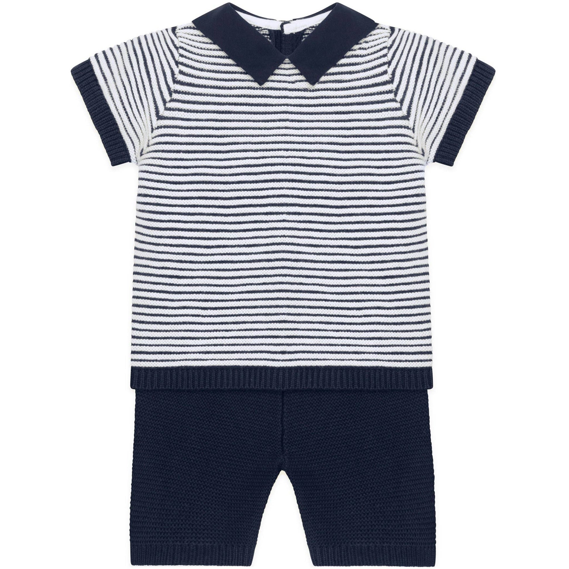 This adorable little baby boy’s navy and white knitted two-piece is the perfect transitional piece when it's slightly cooler. The navy top features contrasting white rows of ridge stitching across the chest and sleeves. A navy collar and short sleeve ribbing contrast beautifully. The navy knitted shorts have a soft elasticated waist for baby’s comfort, perfect for a snuggle.