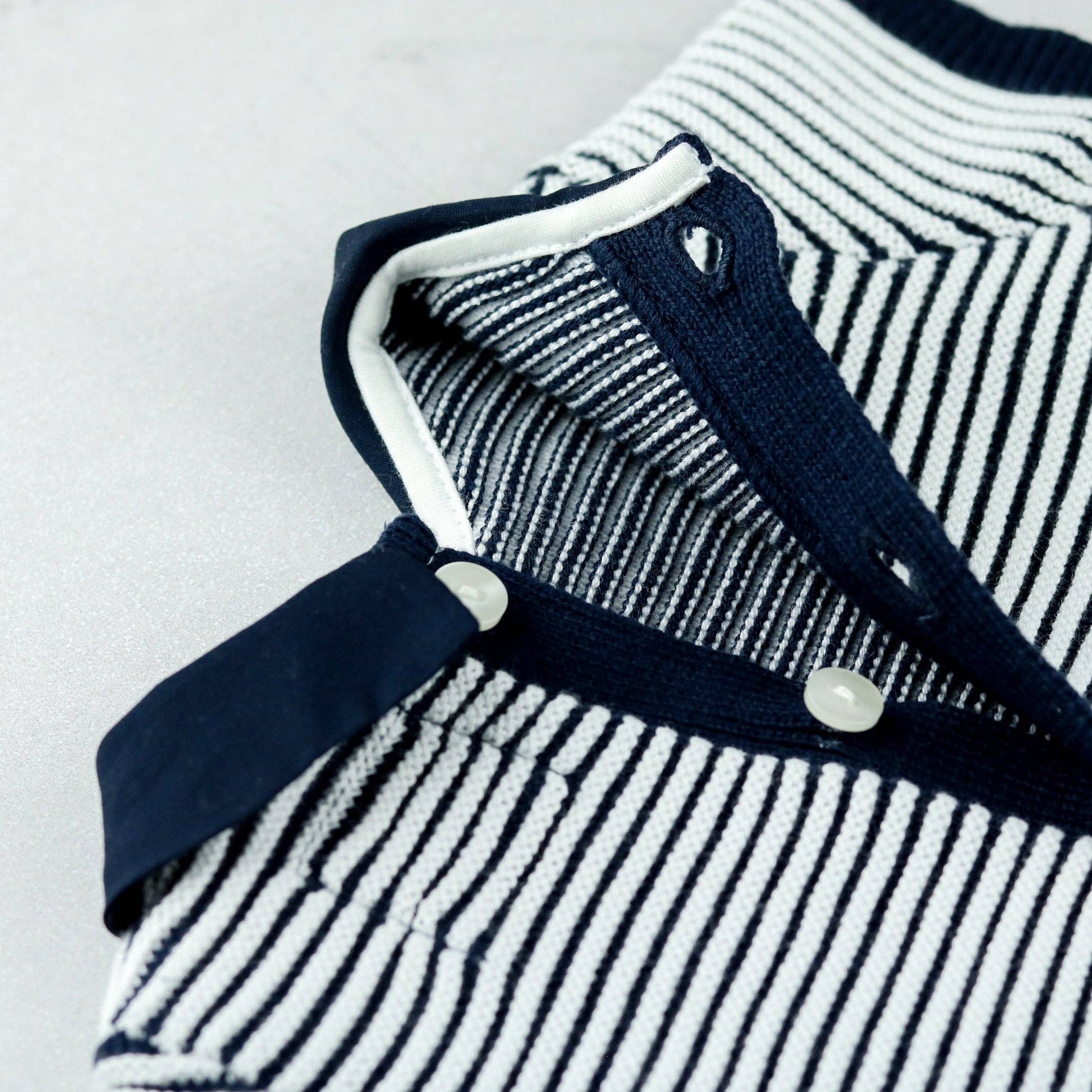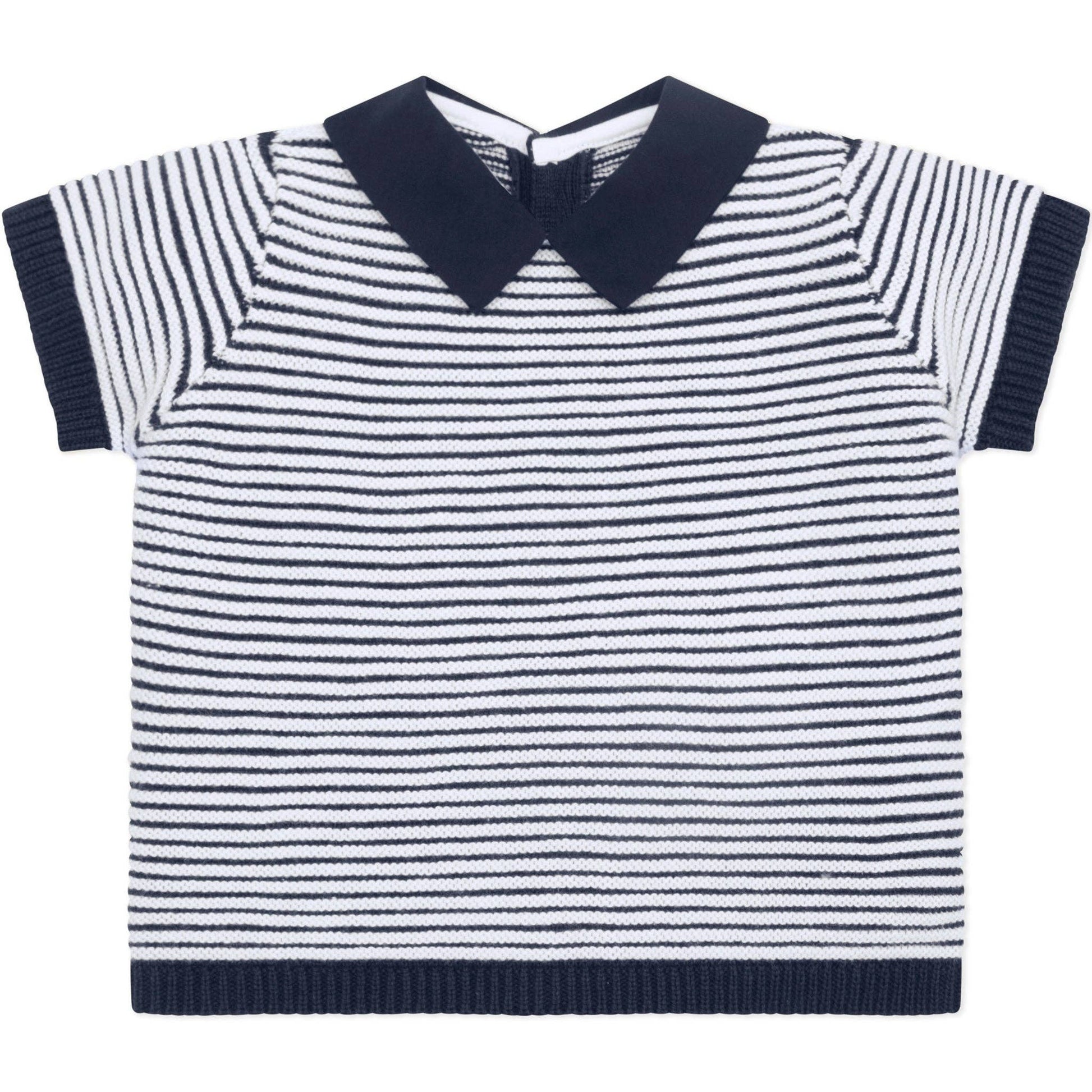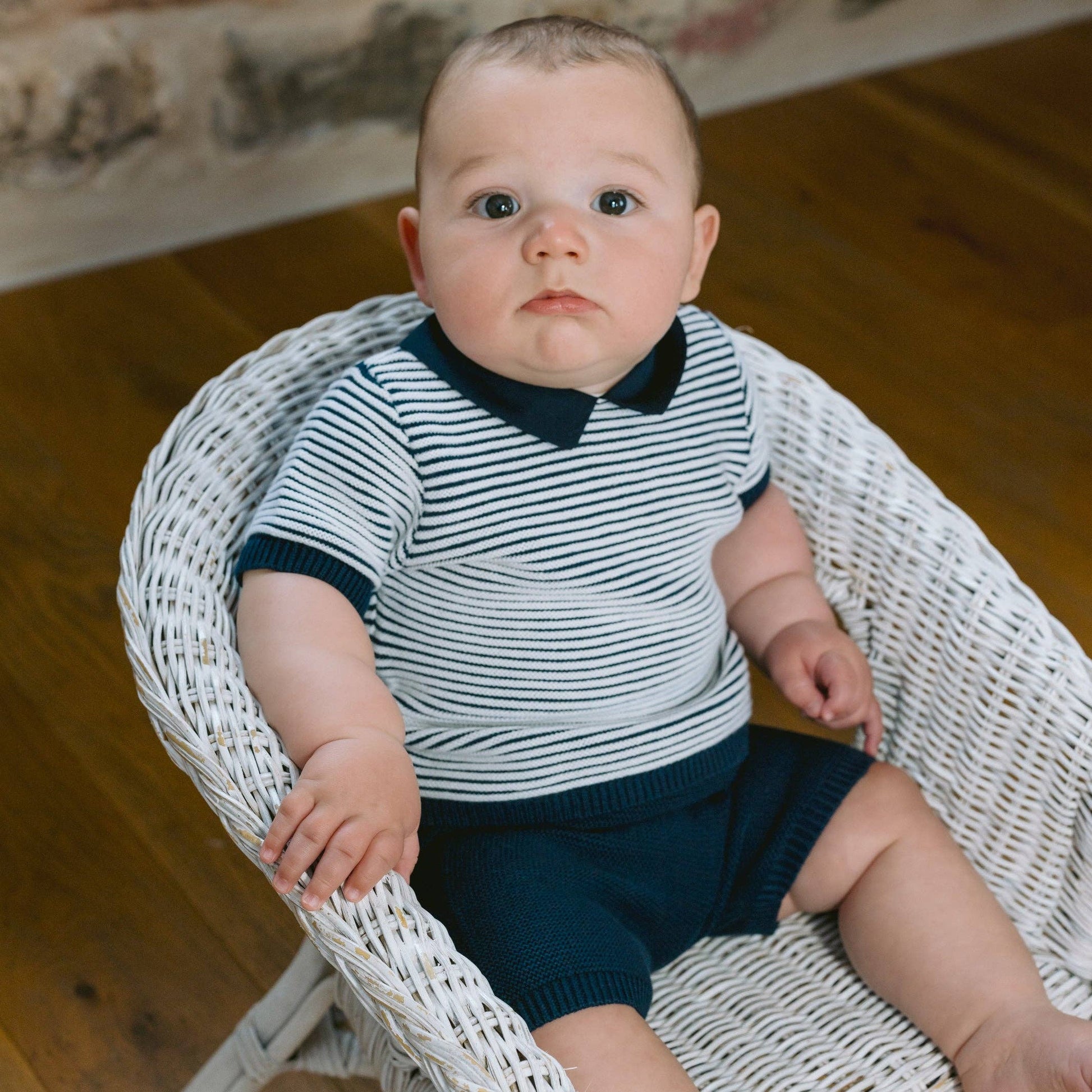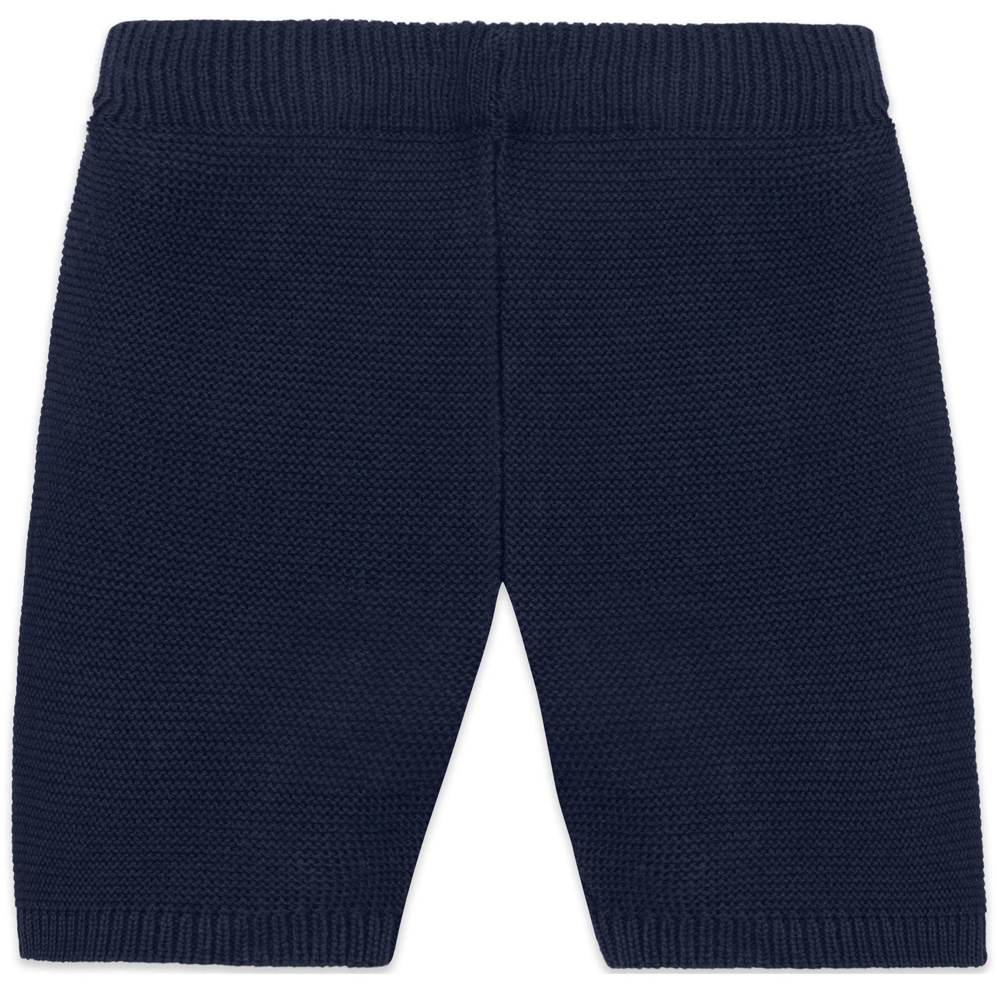 This adorable little baby boy’s navy and white knitted two-piece is the perfect transitional piece when it's slightly cooler. The navy top features contrasting white rows of ridge stitching across the chest and sleeves. A navy collar and short sleeve ribbing contrast beautifully. The navy knitted shorts have a soft elasticated waist for baby’s comfort, perfect for a snuggle.