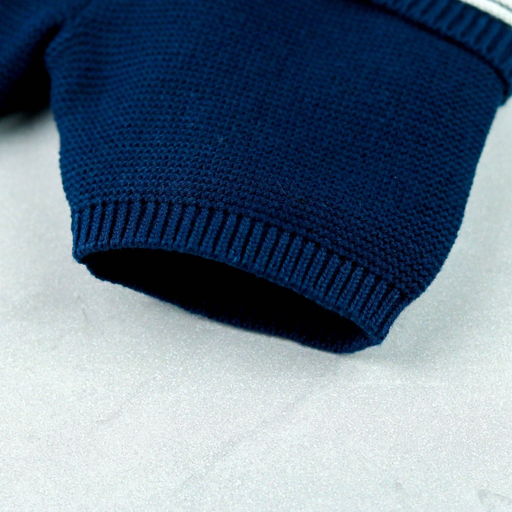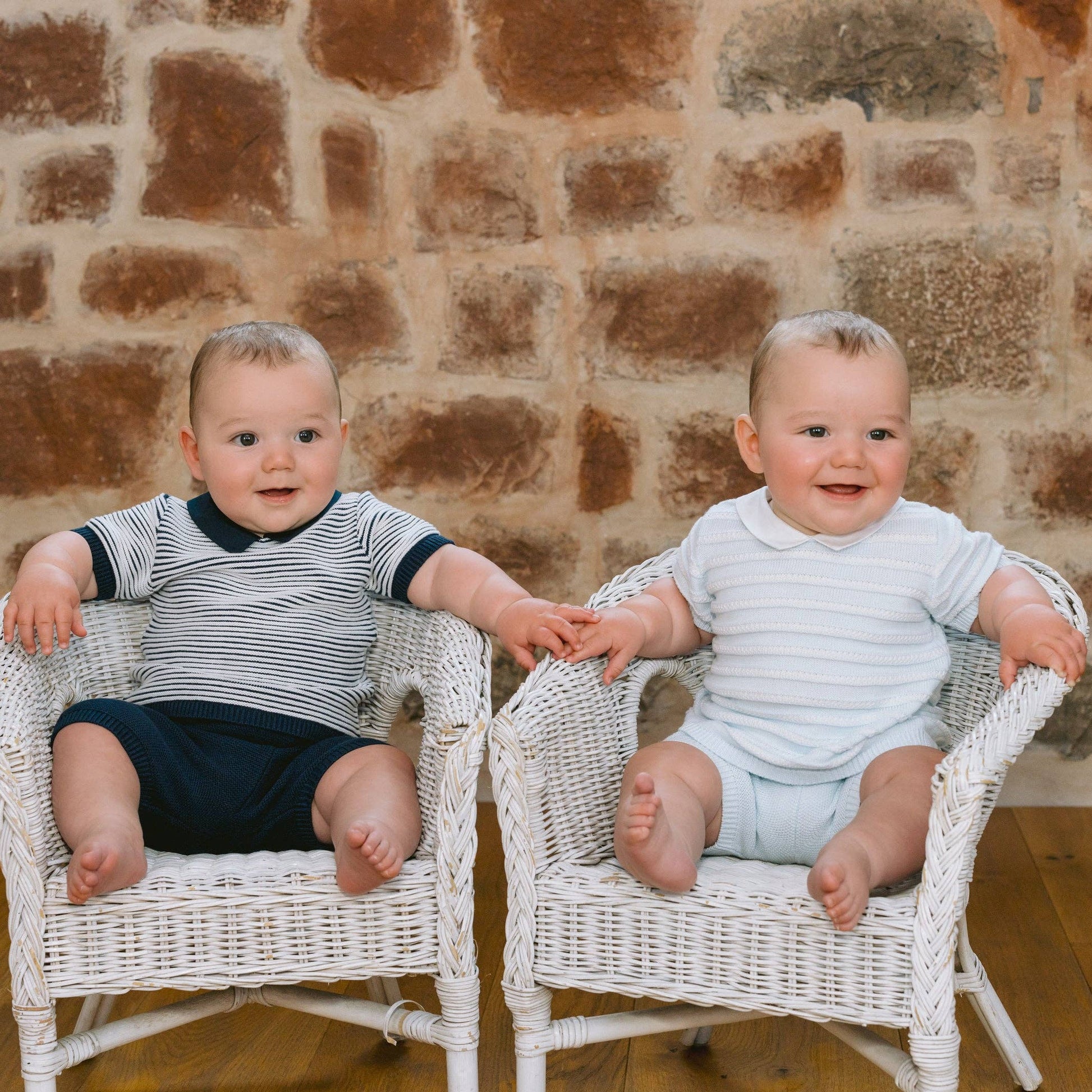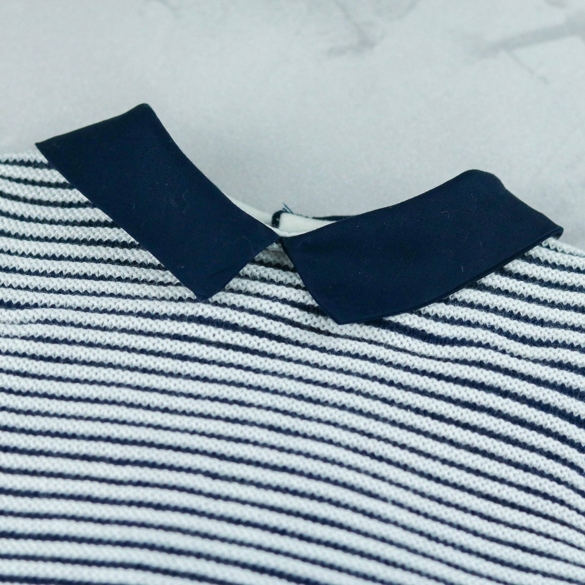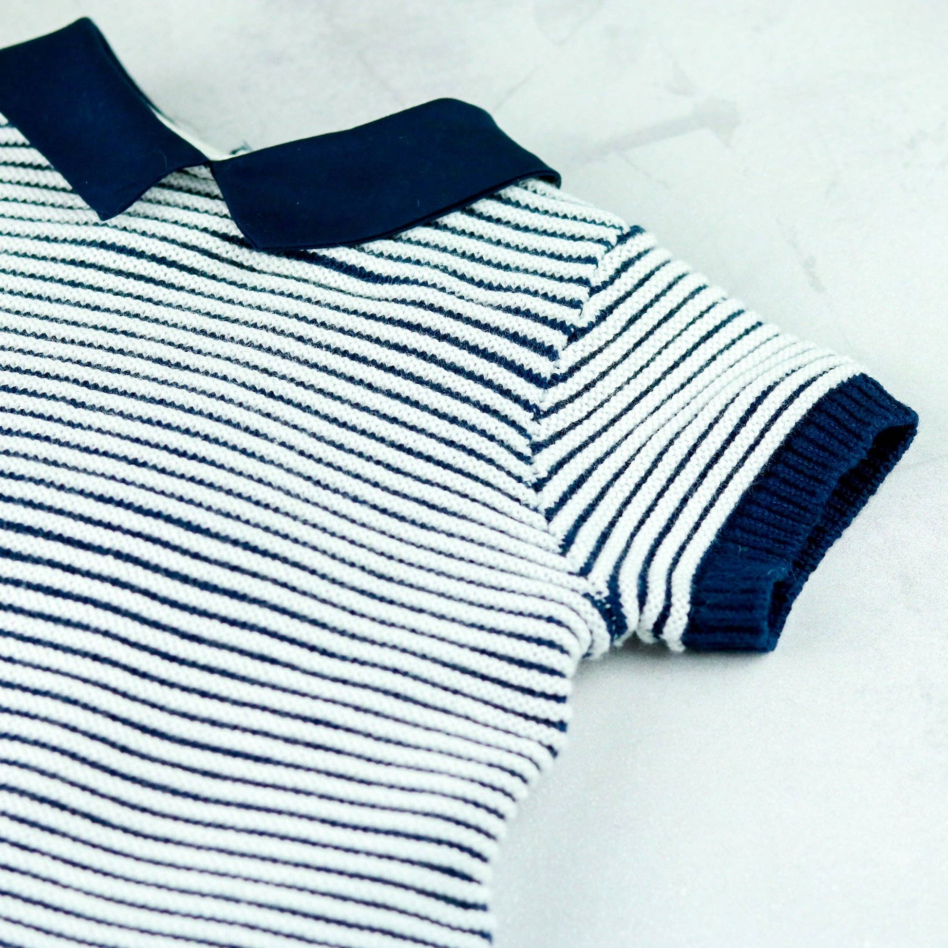 This adorable little baby boy’s navy and white knitted two-piece is the perfect transitional piece when it's slightly cooler. The navy top features contrasting white rows of ridge stitching across the chest and sleeves. A navy collar and short sleeve ribbing contrast beautifully. The navy knitted shorts have a soft elasticated waist for baby’s comfort, perfect for a snuggle.